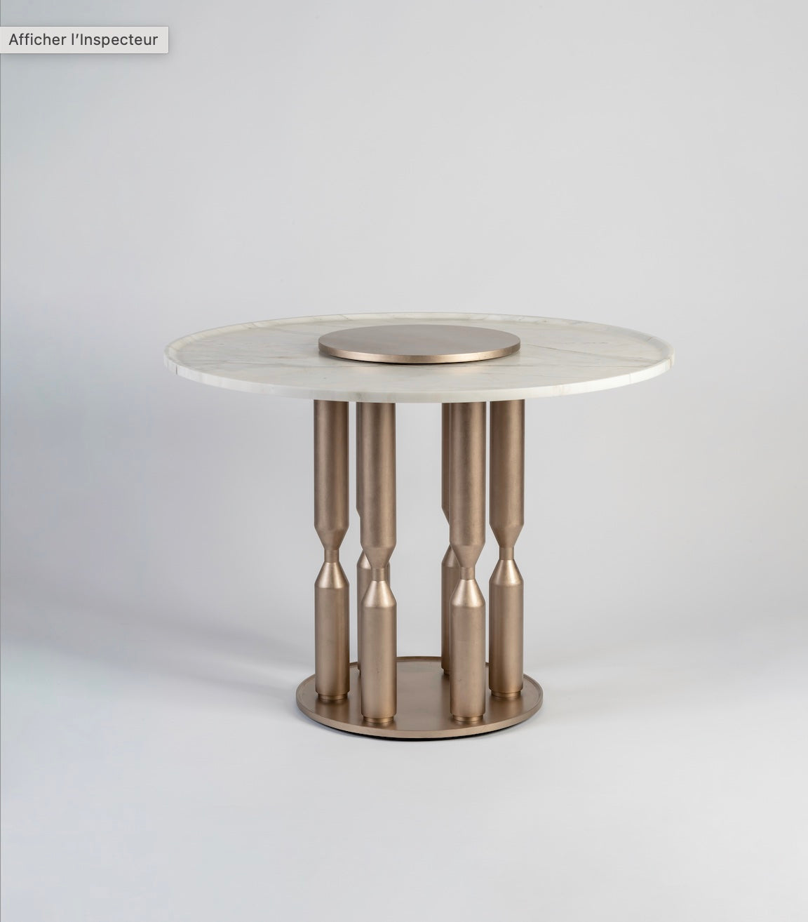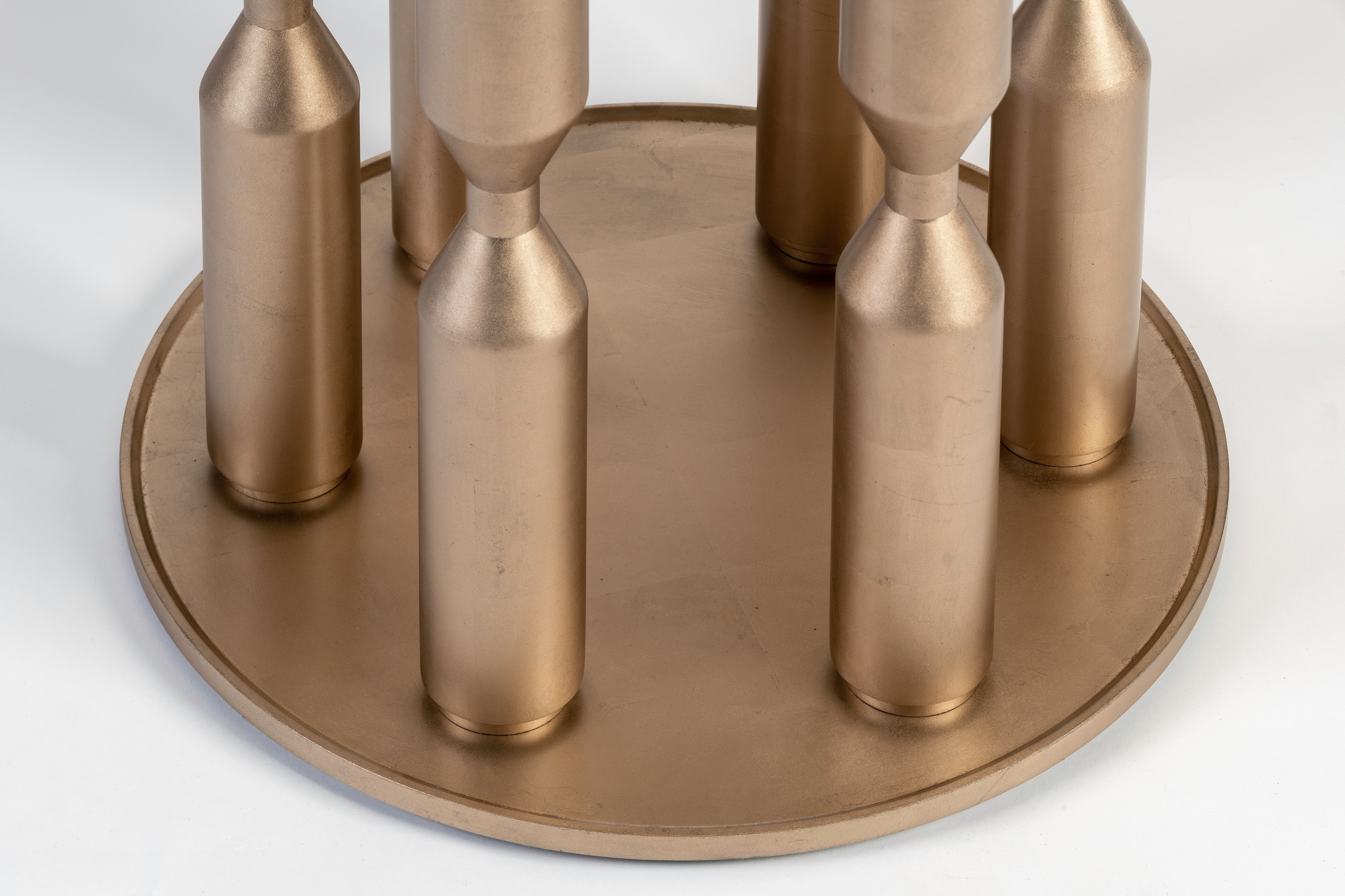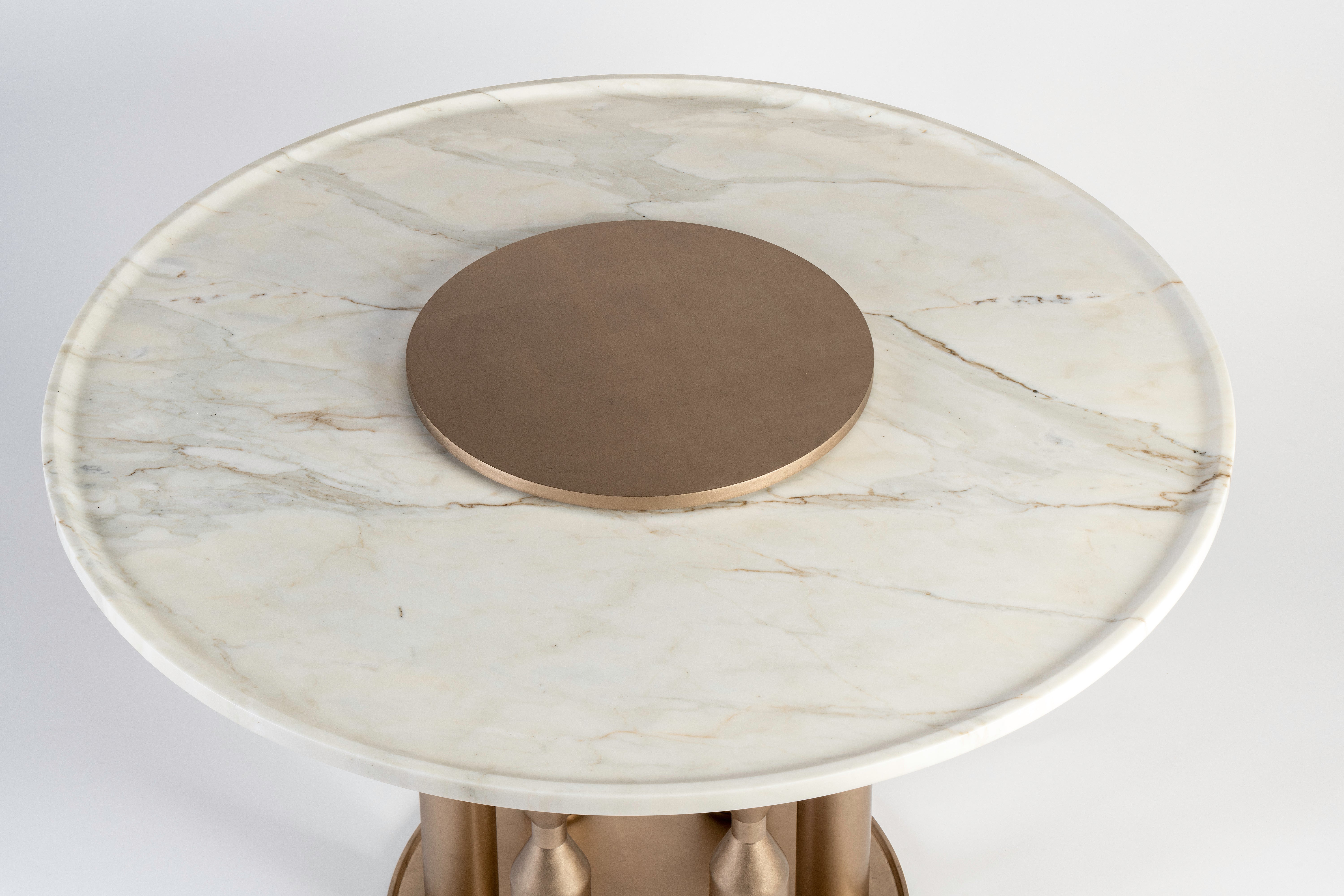 Cette table est inspirée par le temps qui passe. Son plateau en marbre qui accueille en son centre une plaque ronde en métal ressemble au cadran d’une montre et la forme des pieds en métal nous rappelle celle des sabliers.